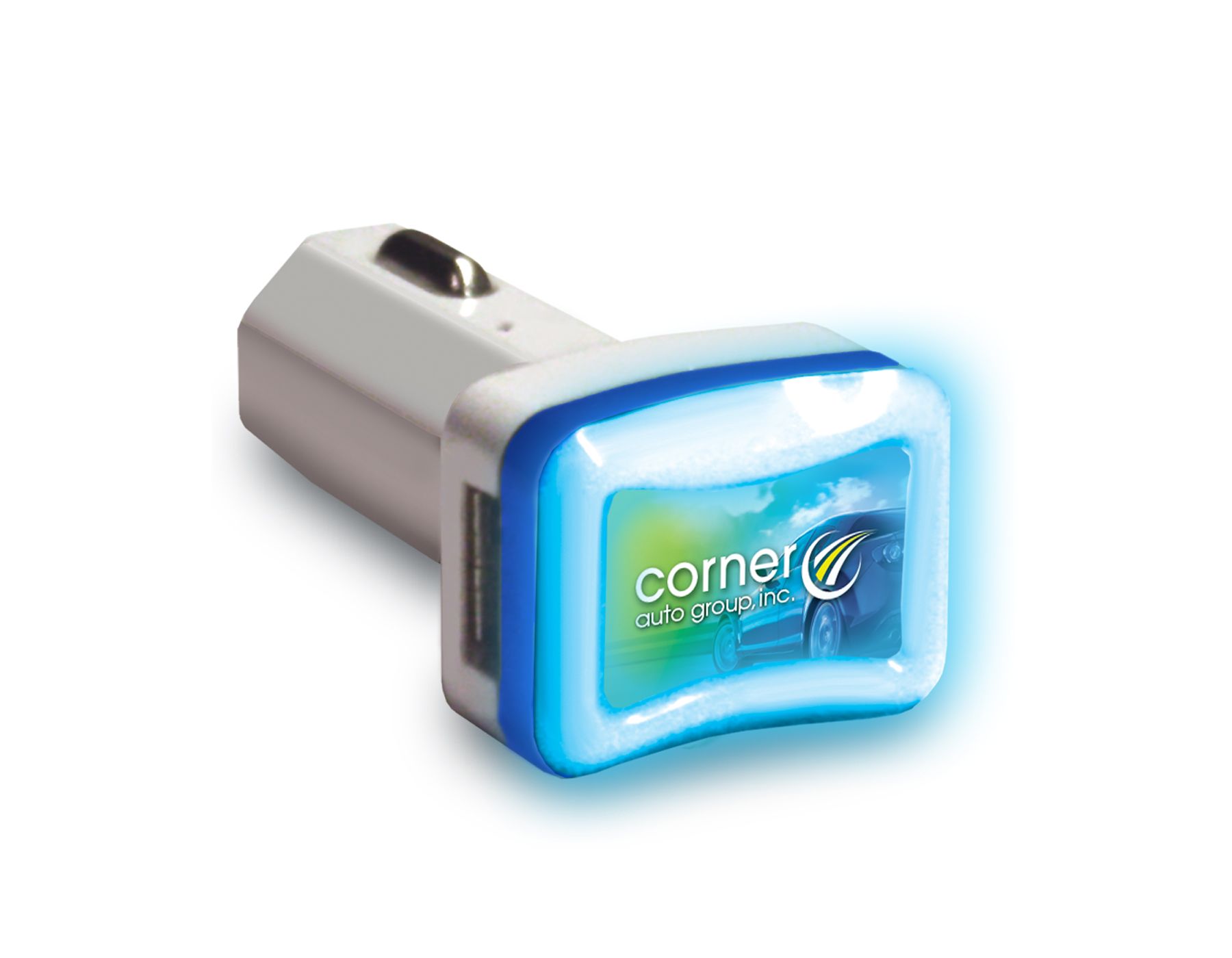 Charge multiple devices at the same time with this light-up USB charger. This handy car charger has dual 2.1A USB ports and a blue LED ring that helps illuminate your logo in the dark. This charger is also compatible with most USB charging cables and fits into any 12V power port.